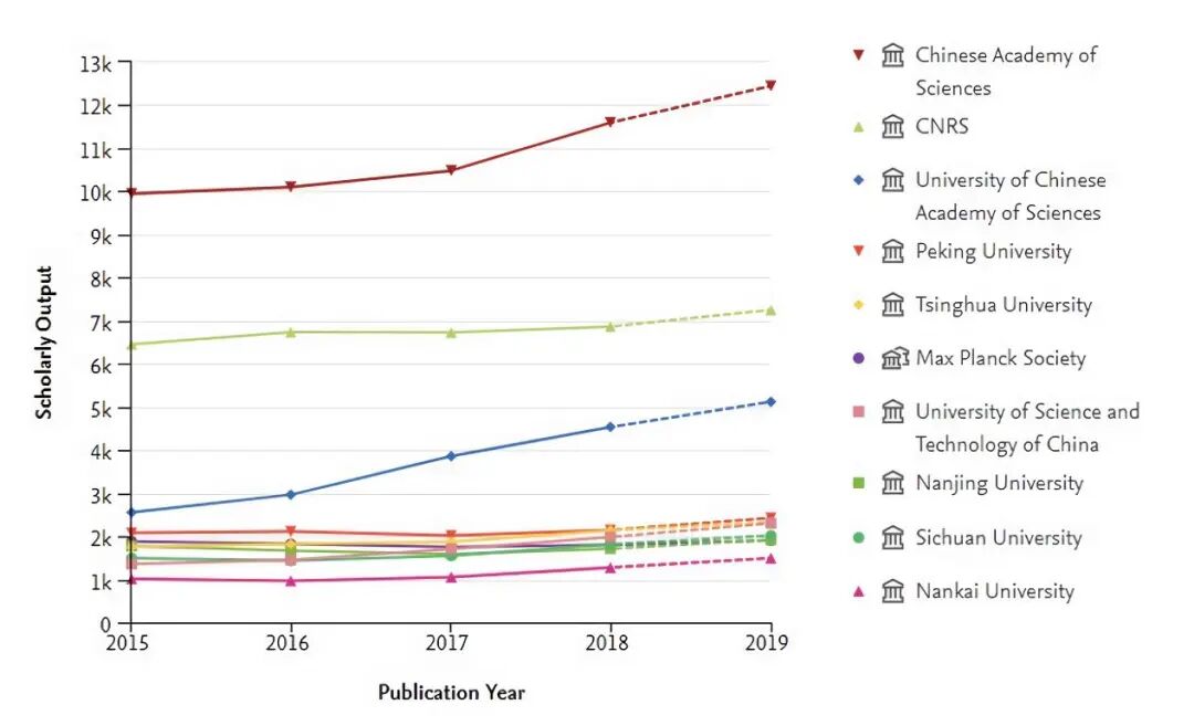(数据来源:Scival,注:虚线部分表示当年统计数据不完整)