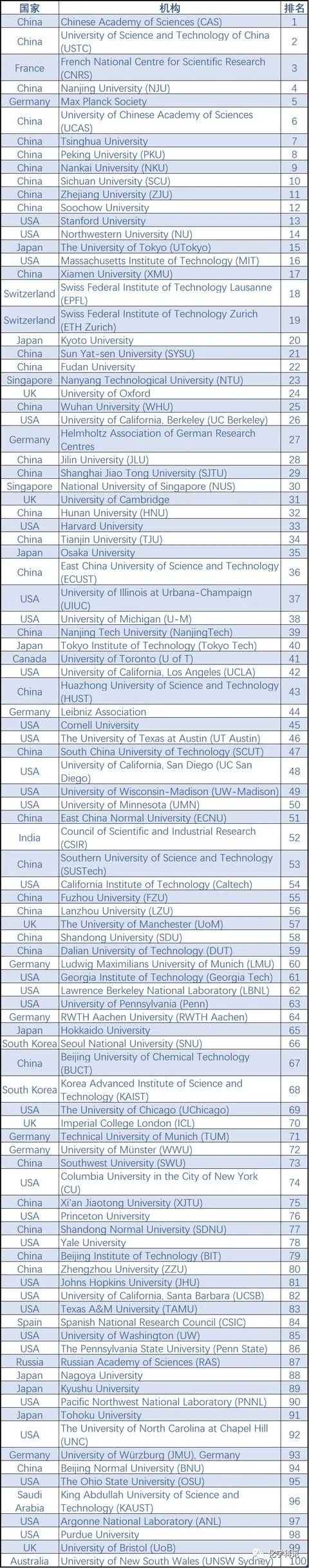 2020 自然指数年度榜单科研机构综合排名前十名单。(图源:Nature Index)