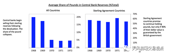 左图注释:在英镑贬值后各国央行开始抛售英镑储备。英镑在储备中的占比骤降。右图注释:英镑协议成员国承诺,只要英国政府保证以美元衡量的英镑储备价值的90%,成员国会继续持有英镑储备。