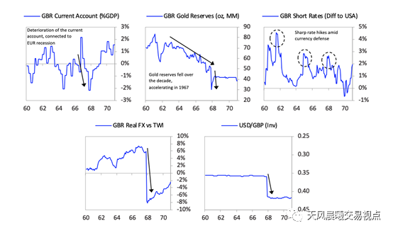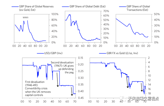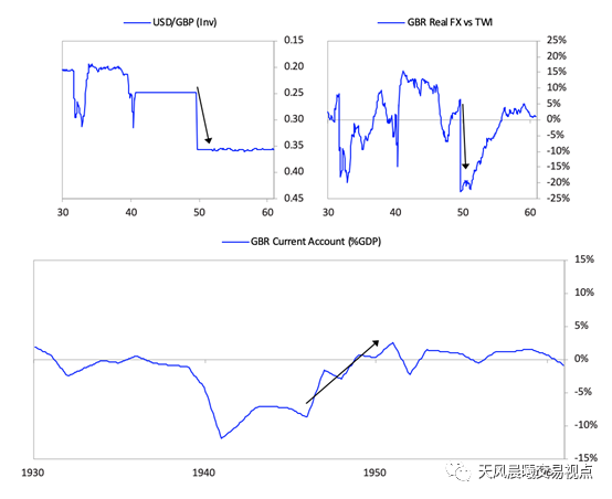注:下图左一1946-1949年间,英国去除资本管制时,发生英镑转换危机引发的英镑第一次大幅贬值,并在1967年英国放弃保卫与黄金挂钩导致第二次大幅贬值。