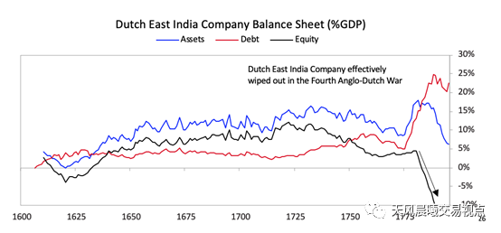 如下图所示,荷兰东印度公司实际上是具有经济和军事力量的公司,它在1780年开始承受损失,在第四次英荷战争期间损失惨重。
