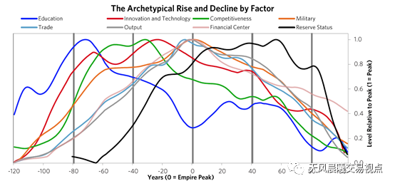 下图来自第1章,大国的实力曲线是通过八项实力指标——教育、创新和技术、竞争力、军事、贸易、产出、金融中心和储备地位——来合成的。下图显示了这些实力指标平均水平的曲线,其中最近的三个储备国家(美国、英国和荷兰)贡献了的大部分权重。