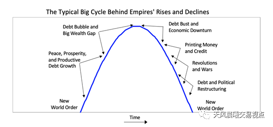 简言之,在一套新的规则建立了新的世界秩序之后,通常会有一个和平和繁荣的时期。随着人们习惯了如此,他们越来越多地押注繁荣将持续下去,他们也越来越多地借钱并用以支出,这最终导致了泡沫。随着繁荣程度的提升,贫富差距也在扩大。最终,债务泡沫破裂,导致印刷货币和信用以及内部冲突的增加,导致某种形式的财富再分配的革命,可能是和平的,也可能是暴力的。通常,在周期的后期,赢得上次经济和地缘政治战争的领先帝国相对于繁荣时期崛起的竞争对手来说,实力已经没有那么强大,在糟糕的经济条件和大国之间的分歧下,通常会有某种战争。在债务之外,革命和战争导致经济、国内和世界秩序的崩溃,并带来新的赢家和输家。然后,赢家聚集在一起,创造新的国内和世界秩序。