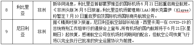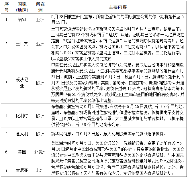对船舶/航班/列车采取措施的情况——截至6月8日,共有149个国家(地区)采取了相关措施。本期更新9个国家,其中土耳其部分机场获得“适航”认证;比利时、意大利、尼日利亚恢复部分或全部航班;美国变更6月16日禁止中国载客航班飞往美国的决定;利比里亚首都蒙罗维亚的国际机场重启商业航班。具体如下: