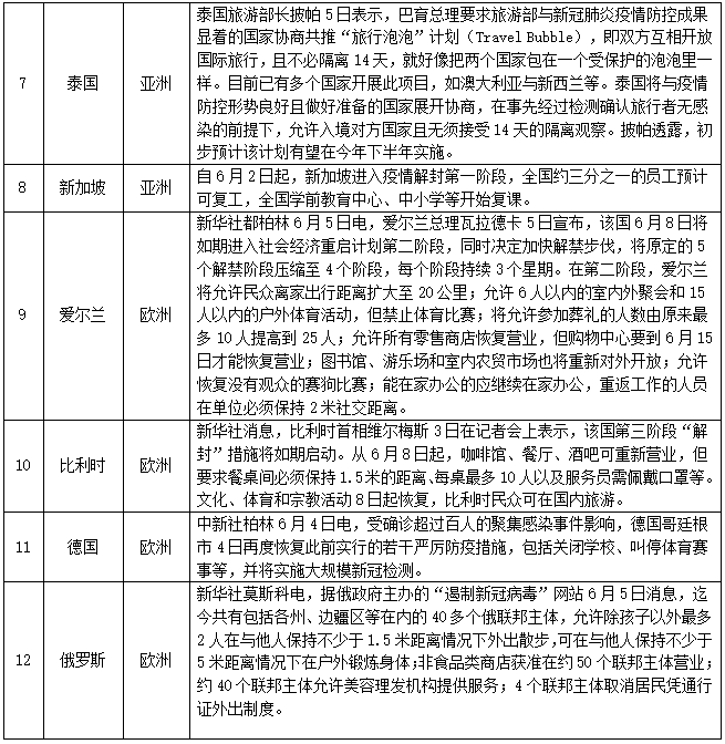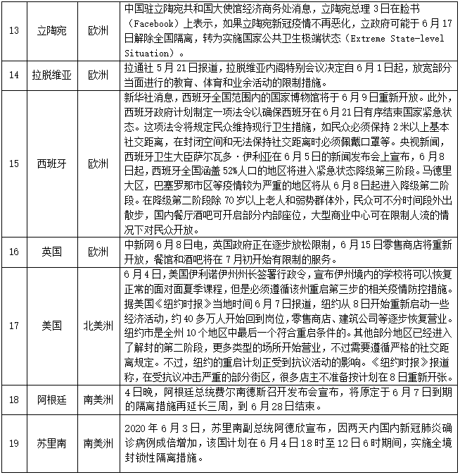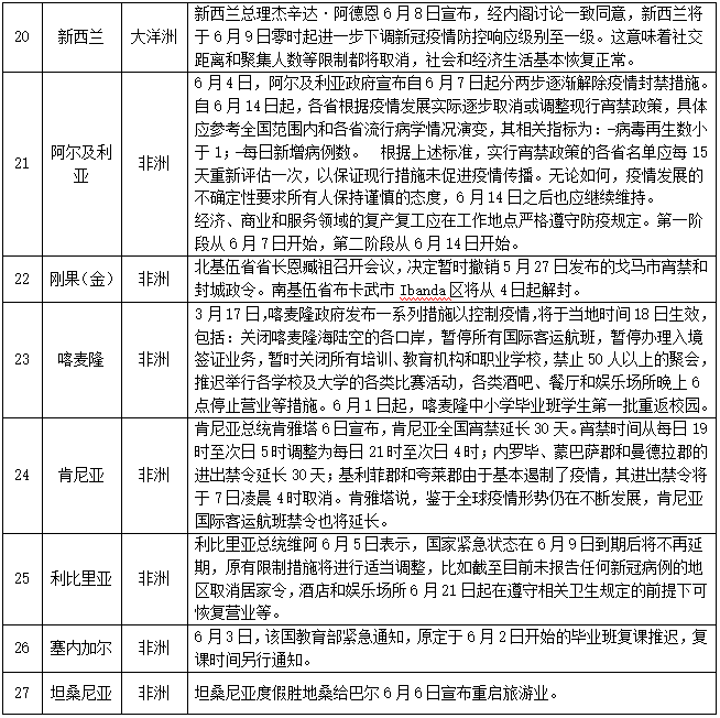 宣布进入紧急状态等情况的国家(地区)——截至6月8日,共有154个国家(地区)采取了相关措施。本期更新29个国家(地区),其中吉尔吉斯斯坦、马来西亚、泰国、新加坡、爱尔兰、比利时、俄罗斯、拉脱维亚、英国、美国、阿尔及利亚、刚果(金)、喀麦隆、利比里亚、坦桑尼亚、突尼斯、乌干达17个国家放松部分管制措施,启动不同程度的复工复产复课;立陶宛、西班牙、新西兰紧急状态降级。具体情况如下: