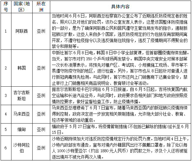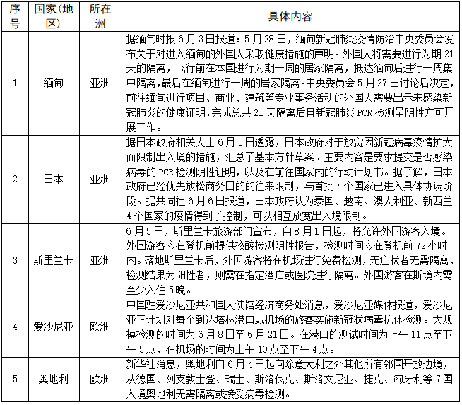 对人员入境采取措施的情况——截至6月8日,共有178个国家(地区)采取了相关措施。本期更新12个国家,其中日本、斯里兰卡、荷兰、立陶宛、意大利、美国允许部分外国人入境;奥地利对部分国家入境人员免除隔离或检测;德国取消对部分国家的旅行警告;阿尔及利亚签证到期自动延长。具体如下: