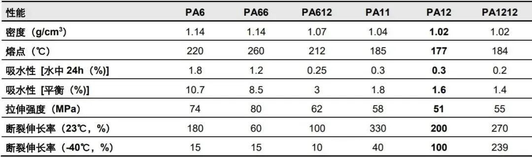 △尼龙的性能比较。资料来源:《尼龙 12 的开发与应用》,立悦化工,长江证券研究所