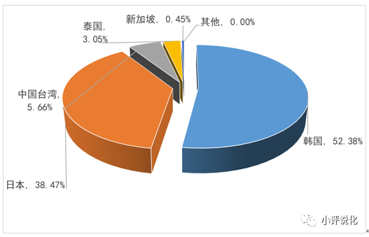 2020年4月中国进口乙烯总量11.07万吨,进口前五位国家/地区进口量共11.07万吨,其中韩国进口量5.80万吨 ,占比52.38%;日本进口量4.26万吨,占比38.47%;中国台湾进口量0.63万吨,占比5.66%;泰国进口量0.34万吨,占比3.05%;新加坡进口量0.05万吨,占比0.45%;
