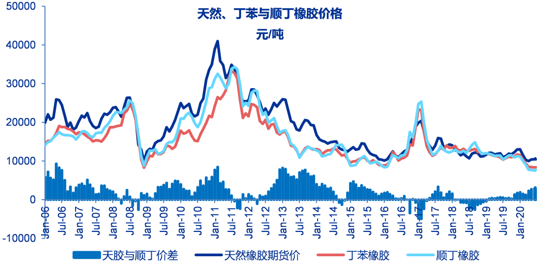 至6月19日当周天然橡胶与顺丁橡胶BR9000的价差2593元/吨,较之前一周下降526元/吨。