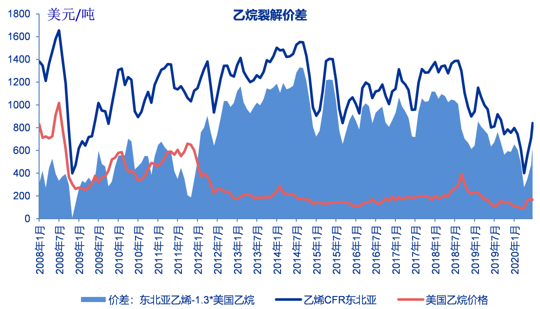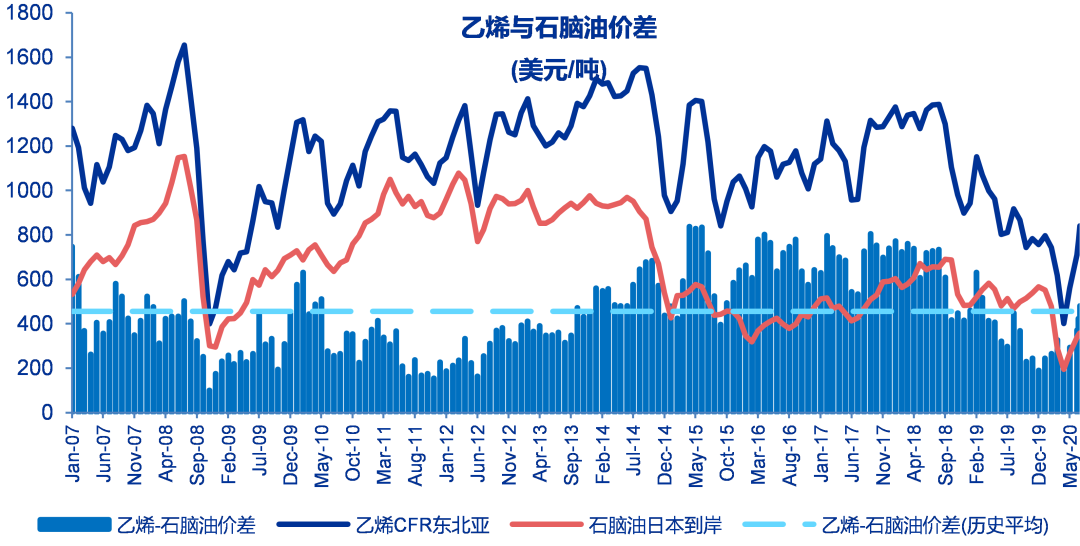 至6月19日当周乙烯与石脑油价差481美元/吨,较之前一周上涨58美元/吨,历史平均457美元/吨。