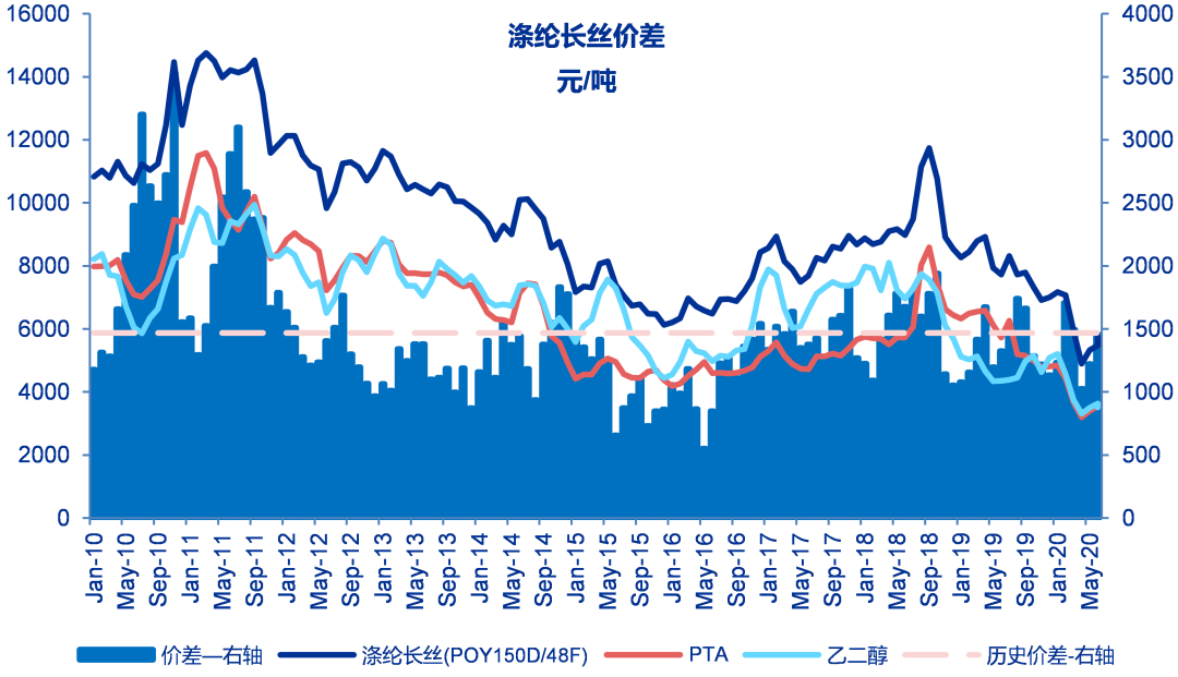 至6月19日当周涤纶长丝POY价差为1321元/吨,较之前一周下降134元/吨,历史平均为1467元/吨。