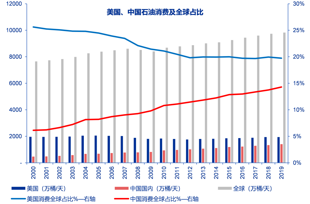 根据最新的BP能源统计数据,2019年美国石油消费1940万桶/天,同比下降0.1%,石油消费在全球占比为19.7%。而根据EIA的数据,我们以美国的原油产量,考虑到原油的净进口以及炼油产品的净出口,美国在2019年的石油产品的消费平均为1331.5万桶/天。这其中的差异除美国的石油产品出口因素外,主要为BP的石油定义中包括原油以及凝析油、NGL等。