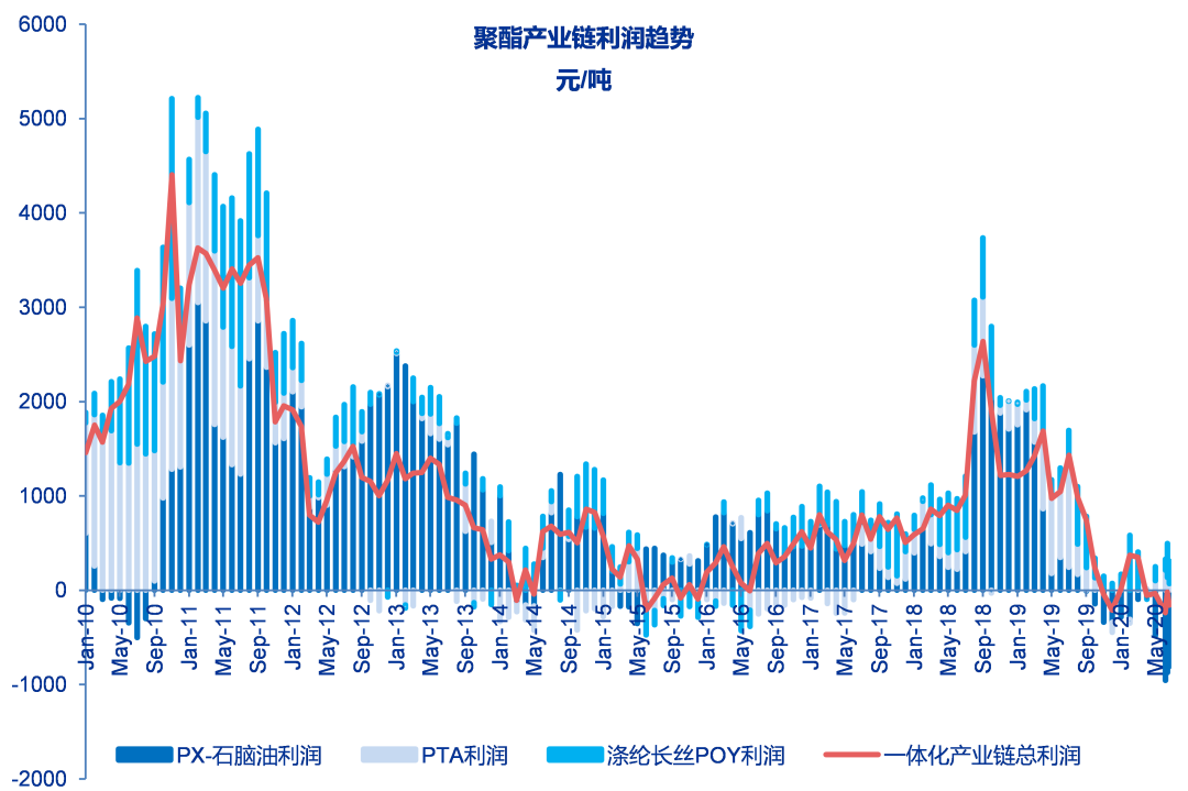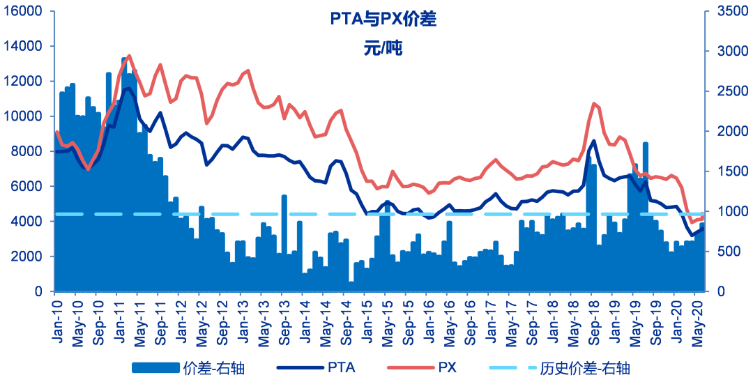 至6月19日当周PX与石脑油价差在186美元/吨,较之前一周上涨10美元/吨,价差历史平均为426美元/吨。