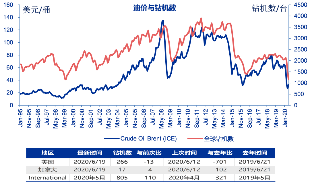 全球钻机数:Baker Hughes公布2020年5月全球钻机数共1176台,较上月环比减少338台,较去年同比减少1006台;其中美国钻机数348台,环比减少218台,同比减少638台;加拿大钻机数23台,环比减少10台,同比减少47台;除美国、加拿大之外的钻机总数为805台,环比减少110台,同比减少321台。