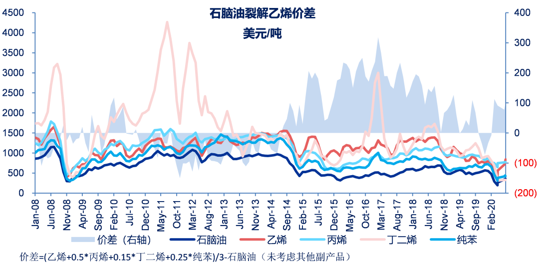 看好丙烯-聚丙烯产业链。由于近期炼油开工下降,加之疫情扩散,预计近期东北亚地区乙烯、PX等开工率仍然受限。丙烯仍有大约30%的供应来自于炼油厂催化裂化FCC装置,炼厂开工率下降或致未来供应紧张。丙烯下游需求稳定,目前全球需求超过1亿吨/年,年新增需求量或在500万吨以上,由于新建炼油产能的对应FCC装置减少,以及裂解乙烯原料的轻质化对应丙烯收率的降低,PDH开工难度较大,未来丙烯或仍将有供应的缺口。