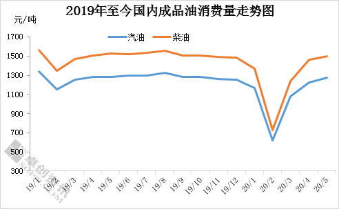 由上图可以看出,2020年上半年,中国成品油消费量呈现“V”型走势。卓创资讯数据统计显示,2020年一季度中国汽油消费总量为2860.89万吨,同比下降23.53%,柴油消费量为3336.96万吨,同比下跌23.80%。5月份,中国汽油消费量1278万吨;柴油消费量1500万吨,基本恢复至去年同期水平。汽油方面,随着公共卫生事件对国内影响减弱,五一驾车出行人数增加,终端加油站用户库存稳步消化,节后市场出现一小波补库操作,汽油出货表现较好。柴油方面,由于南方进入雨季,且沿海休渔期正式开始,高速恢复收费等消息对柴油需求形成一定抑制,不过北方地区麦收开始,对柴油需求亦型形成一定支撑。总体来看,汽柴油的消费增速有放缓,但仍保持涨势。