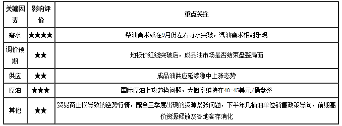 二季度过后,国内成品油市场需求端面向好转,但炼厂环节开工率大幅度上涨。市场供应环节充足,出口转内销,市场雪上加霜。贸易商历经几波抄底操作后,高价资源无法释放,各单位客存压力明显,市场呈现“敌不动,我不动,敌若动,我亦谨慎而动”。