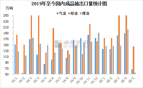 从海关数据显示看,2020年5月份,汽油、柴油、航煤出口量环比锐减58.62%。此前,卓创给出二季度成品油出口量下跌为大概率事件的预测。