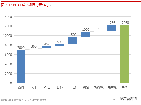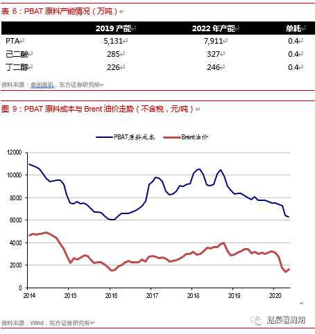 PBAT属于石化基可降解材料,由对苯二甲酸(PTA)、己二酸(AA)和丁二醇(BDO)聚合而成,原料都源自原油和煤炭,原料成本基本在6000-10000之间波动,与油价保持相同的变化趋势。如果油价保持在目前40美元/桶左右的区间,预计PBAT的原料成本也不会超过7000元/吨。