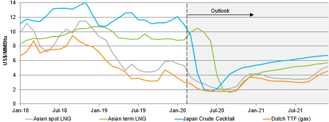预计2020年油价大跌将使亚洲非现货LNG与现货LNG长期存在的价差基本消除(图5)。从图中可看出,从2019年初到2020年1月,全球LNG市场供大于求,导致LNG现货价格不断走低,比非现货价格低得多,2019年四季度均价价差达3.5美元/MMBtu。但是,油价大跌直接导致JCC油价下调,使亚洲LNG非现货价格下跌至十年来的新低,甚至跌至低于现货价格,这样,LNG非现货和现货之间的价差就基本消除。预计今年第四季度LNG非现货价格可能比现货要低0.5美元/ MMBtu。2021年初开始,LNG非现货和现货之间的价差将再次出现;但到2021年冬季,对现货LNG需求增高,价差将再次缩小。
