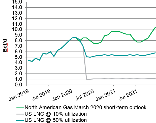 那么,美国伴生气产量下降导致LNG气源减少和全球LNG需求下降两大因素将如何影响全球LNG供需平衡呢?IHS对美国LNG生产和出口进行了模拟,考察2021年底美国LNG产能利用率,分别设定为10%和50%两种情境(图3)。从图中可看出,如果产能利用率能达到50%,则LNG气源供应需要约50亿立方英尺/天(520亿方/年);如果产能利用率只达到10%,则LNG气源供应只需要约10亿立方英尺/天(104亿方/年)。