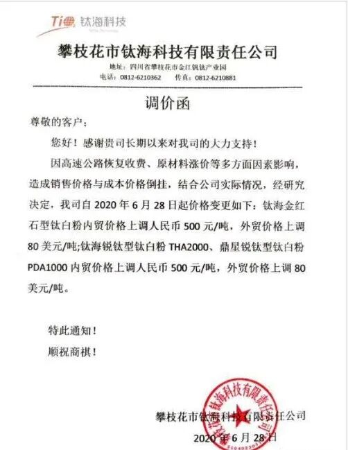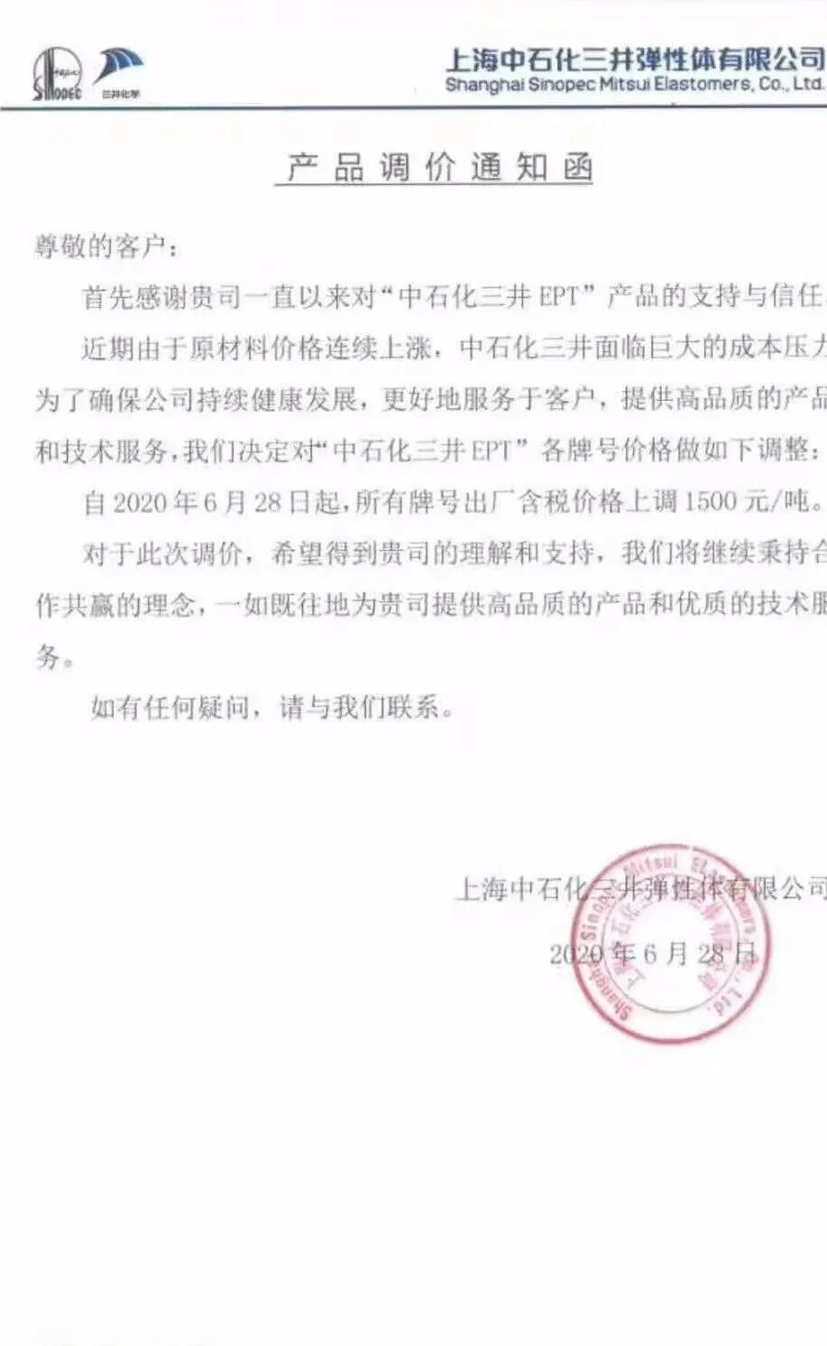 中石化三井弹性体育有限公司发出产品调价通知函:自2020年6月28日起,决定对“中石化三井EPT”所有牌号出厂含税价上调1500元/吨。