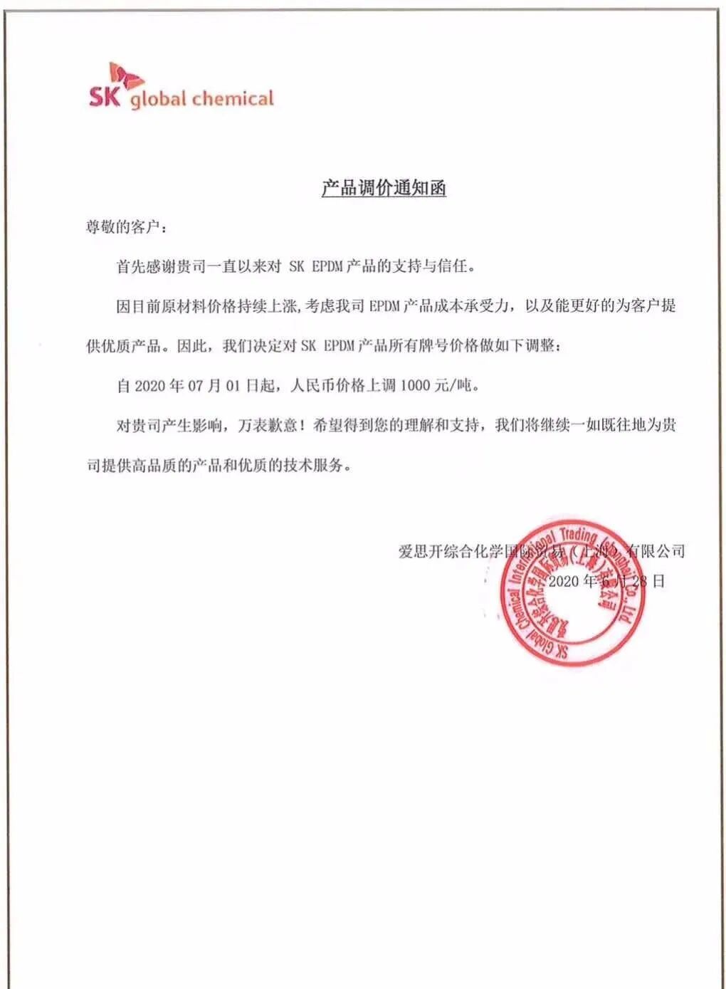 爱思开综合化学国际贸易(上海)有限公司宣布从2020年7月1日起,对SK EPDM产品所有牌号价格上调1000元/吨。