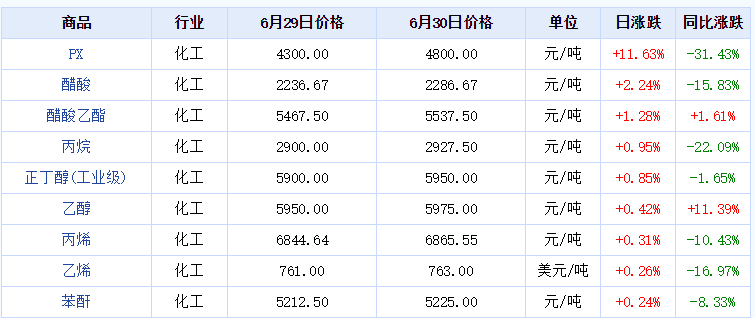 据监测,2020年6月30日大宗商品价格涨跌榜中化工板块环比上升的商品共9种,其中涨幅5%以上的商品共1种,占该板块被监测商品数的1.1%;涨幅前3的商品分别为PX(11.63%)、醋酸(2.24%)、醋酸乙酯(1.28%)。
