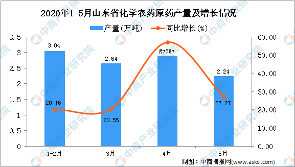 2020年5月山东省化学农药原药产量比上月下降,5月山东省化学农药原药产量为2.24万吨,同比增长27.27%。2020年1-5月山东省化学农药原药产量为10.85万吨,同比增长21.5%。