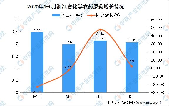 2020年1-5月全国化学农药原药产量87万吨 同比下降1.5%