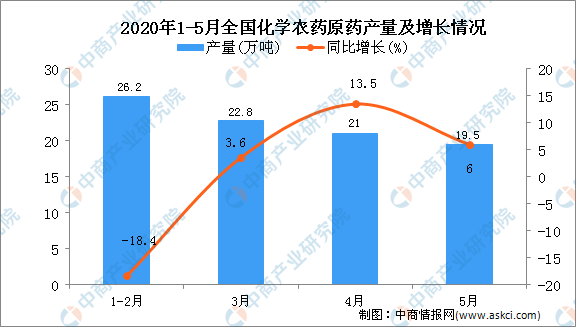 世界农化网中文网报道:据中商产业研究院数据库显示,2020年5月全国化学农药原药产量为19.5万吨,同比增长6%。2020年1-5月全国化学农药原药产量为87万吨,同比下降1.5%。