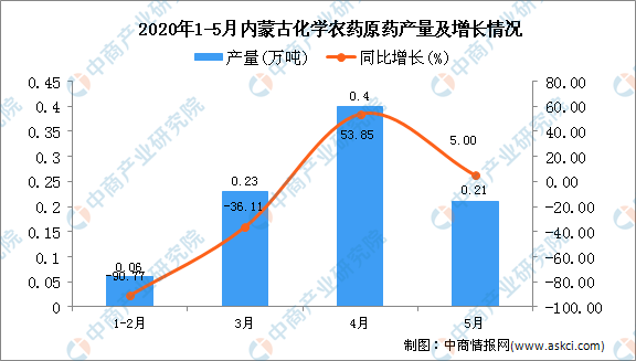 2020年5月内蒙古化学农药原药产量为0.21万吨,同比增长5%。2020年1-5月内蒙古化学农药原药产量为0.9万吨,同比下降38.78%。