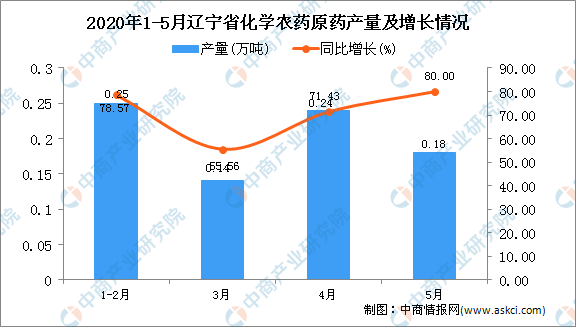 2020年5月辽宁省化学农药原药产量为0.18万吨,同比增长80%。2020年1-5月辽宁省化学农药原药产量为0.8万吨,同比增长66.67%。