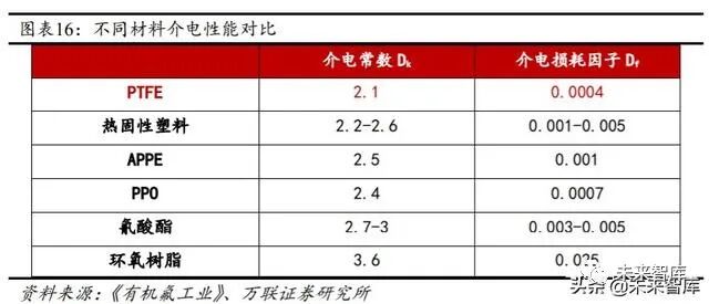 PTFE树脂的Df可低至0.0004、Dk为2.1,是目前为止发现的最符合5G时代要求的CCL 理想基材。除此之外,PTFE也是射频电缆、天线滤波器以及5G所涉及的领域中各类 连接器的重要应用,PTFE无疑将成为5G时代最热的新材料之一。