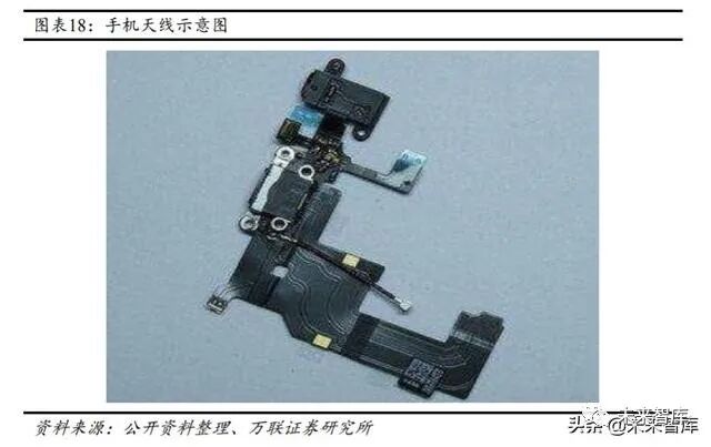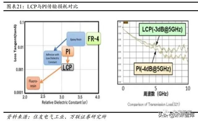 射频天线和手机天线分别是基站和手机中用于收发信号的元件,天线的性能直接决定 了通信的质量。4G时代的主流天线是由前文提到的以PI(聚酰亚胺)为基材的FPC 软板(柔性电路板)和天线模组连接制成的。但由于PI的介电性能相对较差、吸水性 强且其高频传输损耗较大,因此再不适用于需要满足高频、高速传输的5G天线。