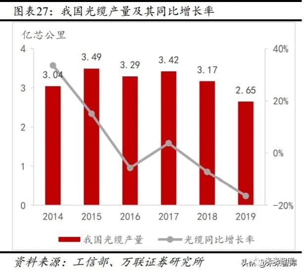 2019年是我国光纤光缆行业的寒冬期,5G有望带领行业回暖。2018年,4G建设开始 进入尾声,我国光纤用户渗透率达到93%,FTTx(Fiber To The Home,光纤入户; Fiber To The Building,光纤入楼)增长也进入瓶颈期,彼时5G也尚未开始进行基础设施建 设,新建光缆里程数以及光缆产量于开始出现下降趋势。2019年,我国新建光缆里程 数仅434万公里,为2015年以来的最低水平;光缆产量仅2.65亿芯公里,为自2014年 以来首次低于3亿芯公里,我国作为光纤光缆产能第一大国,光纤光缆产业出现了严 重产能过剩问题,行业触底进入寒冬。