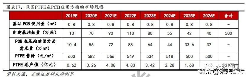 5G基站的PCB使用量(考虑损耗量)在0.8㎡左右,适用于5G的高端PTFE现阶段的售 价约为600元/㎡,若单以PTFE在5G基站PCB中的需求量进行保守估计,当我国5G基站建设量达到500万座时,PTFE在我国5G基站领域的应用规模可达到20亿元以上。