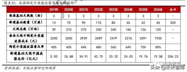 目前陶瓷生产工艺还在发展上升阶段,短期内陶瓷介质滤波器还难以实现大规模量产, 市场上呈现供不应求的状态,且其造价在一段时间内将持续处于高位。后期随着行业 的生产技术精进以及产能提升,陶瓷介质滤波器成本仍有较大下降空间。据悉,目前 基站每面天线中陶瓷介质滤波器的成本价约为3200元,每座基站设置3面天线,则当 我国5G基站总数量达到500万座时,若滤波器的成本价格能够降至目前的60%、陶瓷 介质滤波器在基站中的普及率达到85%,则陶瓷介质滤波器在我国的总市场规模将达 到200余亿元