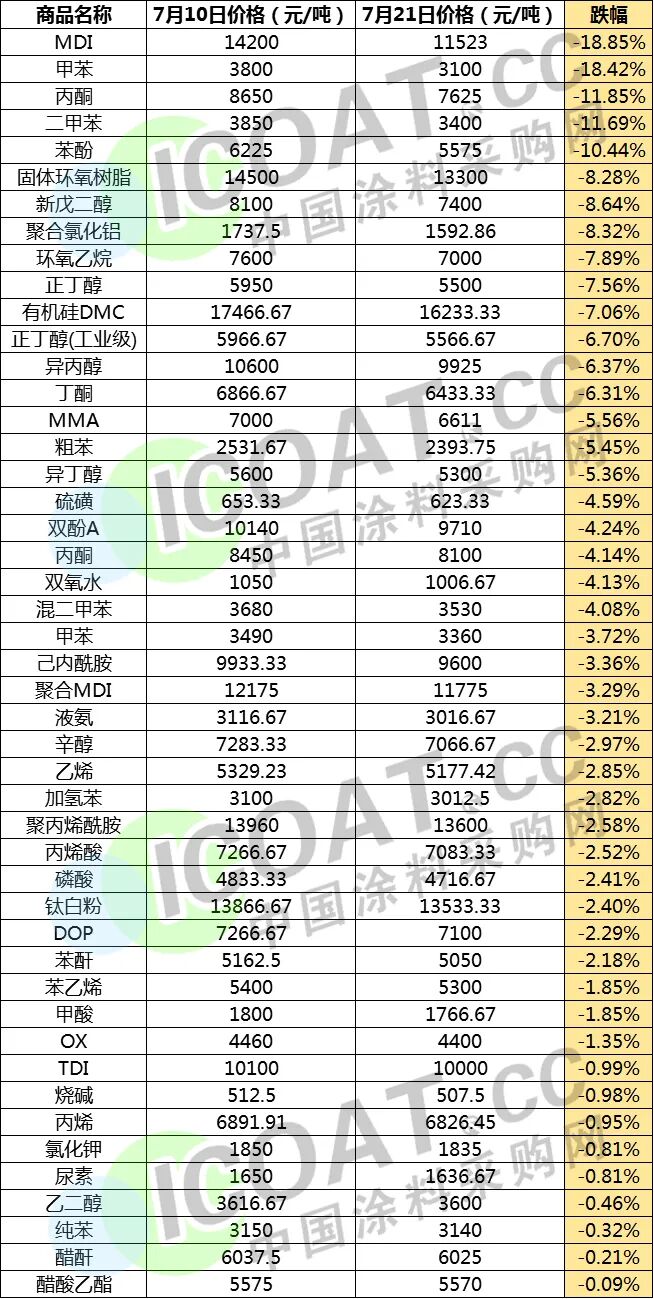 南方洪涝灾害造成了当地多家化工企业生产中止,保守估计,大约有三分之一的园区以及全国数万家化工企业受灾,经济损失不计其数,整个产业链基本上都处于停滞状态,低迷的需求也大大压低了原材料的价格。仅7月10日至21日十几天的时间内,就有众多原材料价格出现下跌的情况。