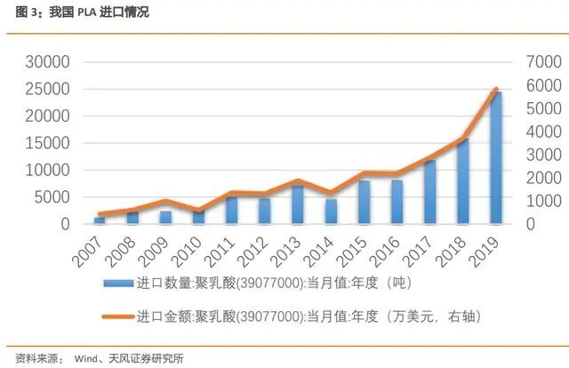 国内 PLA 2018 年进口量为 1.59 万吨,国产化率约 35%。海正、丰源 等公司初步具备 PLA 量产技术,金丹科技 1 万吨、金发科技 3 万吨 PLA 产能规划在建中。
