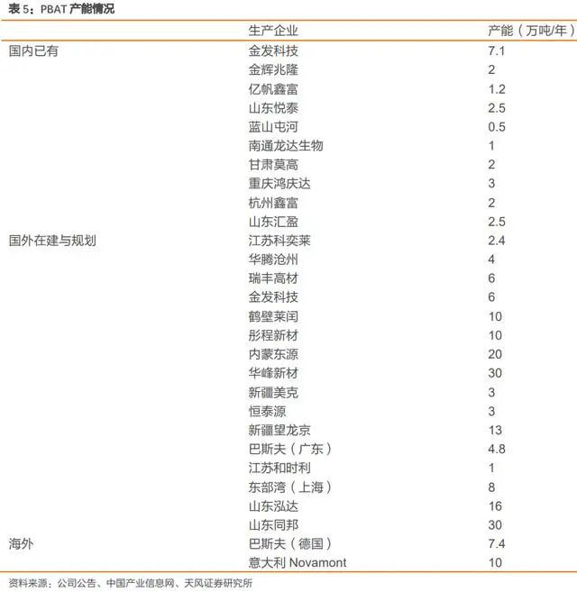 中国为全球最大的 PBAT 生产国家,产能占全球比例达 57%,生产 PBAT 产品性能与海外龙头公司巴斯夫产品性能相似。金发科技 为国内 PBAT 行业龙头,瑞丰高材、彤程新材 6 万吨产能规划在建中。