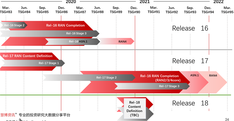 R16标准于2020年7月正式冻结与发布 。R15版本规范主要侧重于eMBB应用场景,R16侧重于uRLLC,R17将纳入mMTC相关规范。
