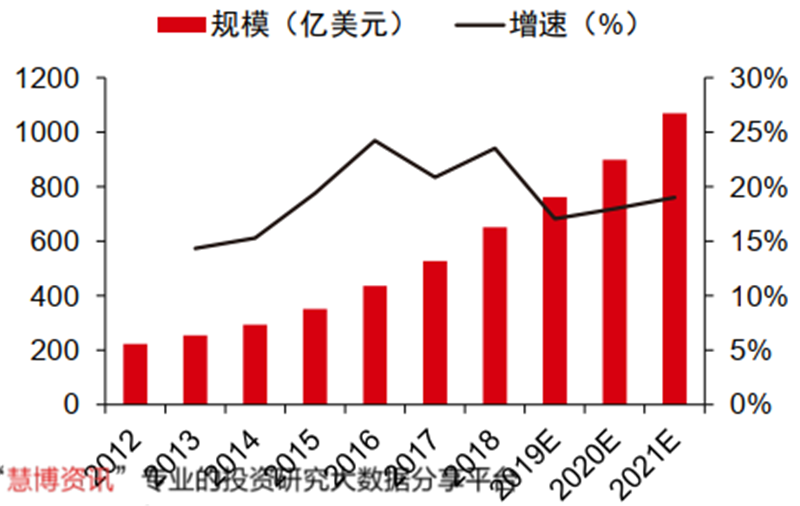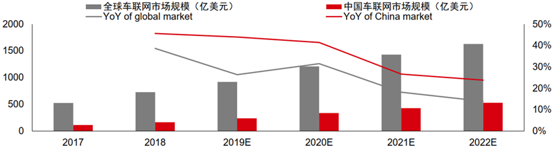 ▲ 全球及中国车联网市场规模及增速(亿美元,%)