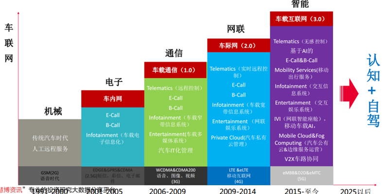 车联网:由低端联接发展至智能网联 。车联网既借助新一代信息和通信技术,实现车内、车与车、车与路、车与人、车与服务平台的全方位网络连接,提升汽车智能化水平和自动驾驶能力,构建汽车和交通服务新业态,从而提高交通效率,改善汽车驾乘感受,为用户提供智能、舒适、安全、节能、高效的综合服务。