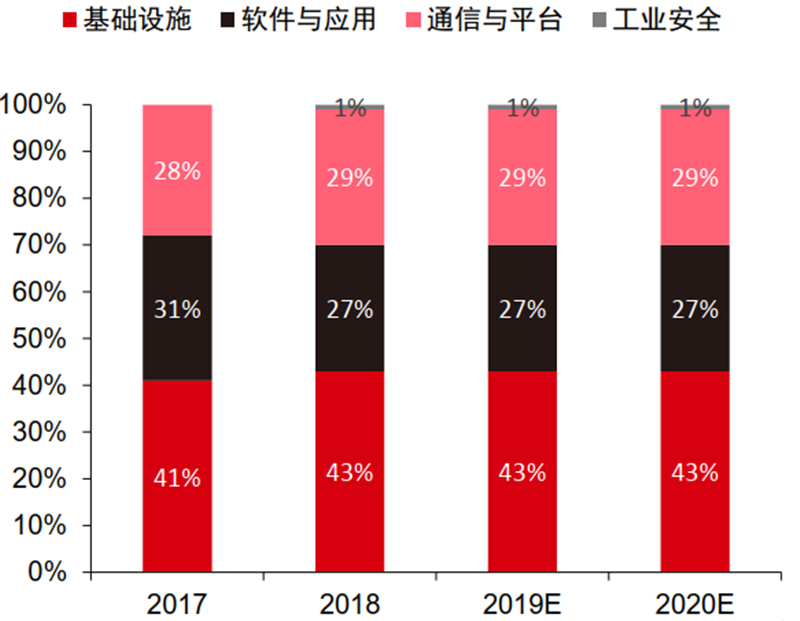 从细分市场结构来看, 2018年, 基础设施、 软件与应用、 通信与平台、 工业安全的占比分别是43%、 27%、 29%、 1%。