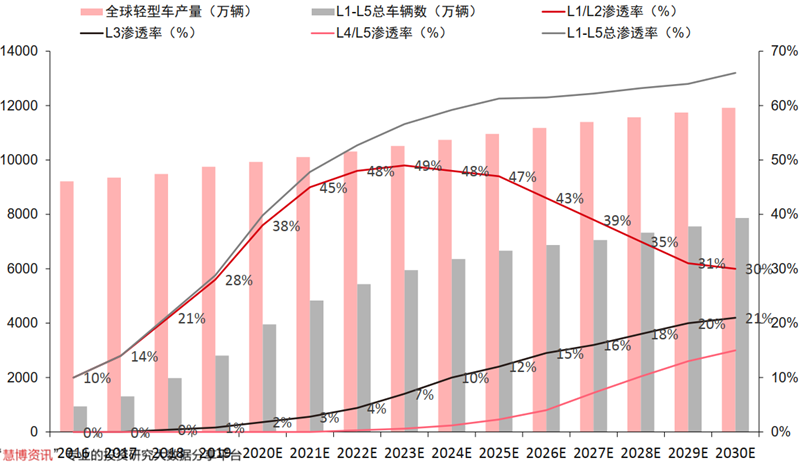▲2016-2030年全球汽车市场自动驾驶渗透率及预测:L1/L2渗透率将于2023年达48%,L3渗透率不断提高