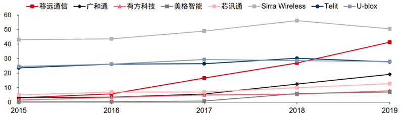 Cat.1借助4G网络基础设施的建设,同样可以为物联网用户提供随时随地接入的机会,其网络基础设施不弱于2G/3G以及NB-IoT,为物联网连接向Cat 1迁移打下较好基础。横向比较,Cat.1比NB-IoT通信能力更强,比eMTC和Cat.4网络成本更低,在中低速业务市场性价比极高。由于准备充分的基础设施和中速率市场的高性价比,移远、广和通、有方等物联网模组厂商纷纷加大了Cat.1产品布局。