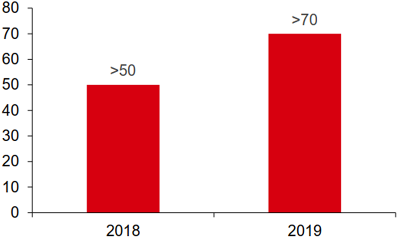 截至2019年5月,全球共有71个国家投资建设了148张NB-IoT网络,其中98张网络商用。同时,中国三大运营商、国外Vodafone、AT&T、Verizon等知名运营商正在积极打造一张全球公用的NB-IOT网络,这有利于中国芯片、模组和终端公司的产品全球化。运营商对于NB-IOT网络的高投入直接导致了NB-IOT连接数的直线攀升,全球NB-IOT用户从2018年末的4000万迅速增长到2019年末的全球连接过亿。在2020年2月,中国NB-IOT连接也已过亿。