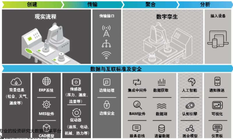 技术架构:IoT+数据+AI分析 。数字孪生要求在现实体配置大量的传感器,如各类IoT设备及边缘计算设备,收集数据实时分析,并在后端布置大量AI软件设备用以运算和反馈。在时间和空间的范畴上,物联网、人工智能、机器学习、软件分析等技术在实时仿真模型中有机结合,仿真模型随着物理模型的变化而更新变动。