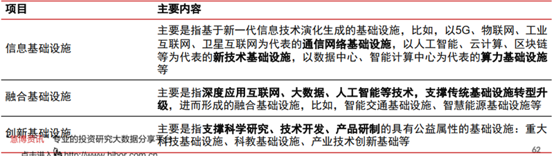 2020年3月4日央视中文国际频道对“新基建”范围的定义 , 央视中文国际频道《中国新闻》 节目报道,新基建包括七大领域:5G基站建设、特高压、城际高速铁路和城市轨道交通、新能源汽车充电桩、大数据中心、人工智能、工业互联网 。